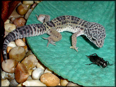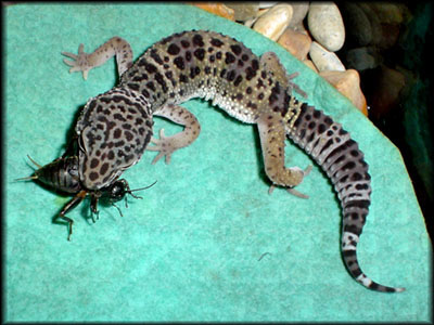 Leopardgeckos är köttätare och i sin naturliga miljö äter de olika insekter, skorpioner, och mindre ödlor. Det är viktigt att variera kosten för att den ska få i sig av alla nödvändiga aminosyror. Man kan utfodra med kackerlackor, syrsor, gräshoppor, mjölmaskar, zoophobasmask samt ibland även musungar. En tumregel säger att man kan utfodra med ett bytesdjur som inte är större än 2/3 av huvudets bredd respektive längd.