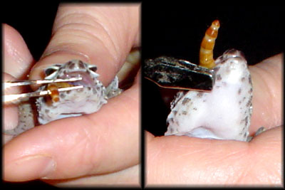 Om geckon bara vägrar att äta, så är det en bra idé att hjälpa den. Det som är enklast att ge i form av matning är larver. De är inte så stora, och därmed något lättare att stoppa in i geckons mun. Använd gärna en pincett, och öppna munnen med pincetten samtidigt som du försöker få in larven ner i halsen. Låter elakt, men ett måste om den inte äter. Sväljreflexen gör att geckon tillslut måste svälja. Minst 8-10 larver är helt ok att mata en halvvuxen gecko med. Mängden larver beror såklart lite på storlek på geckon.